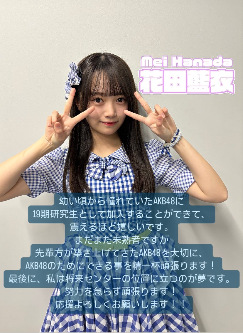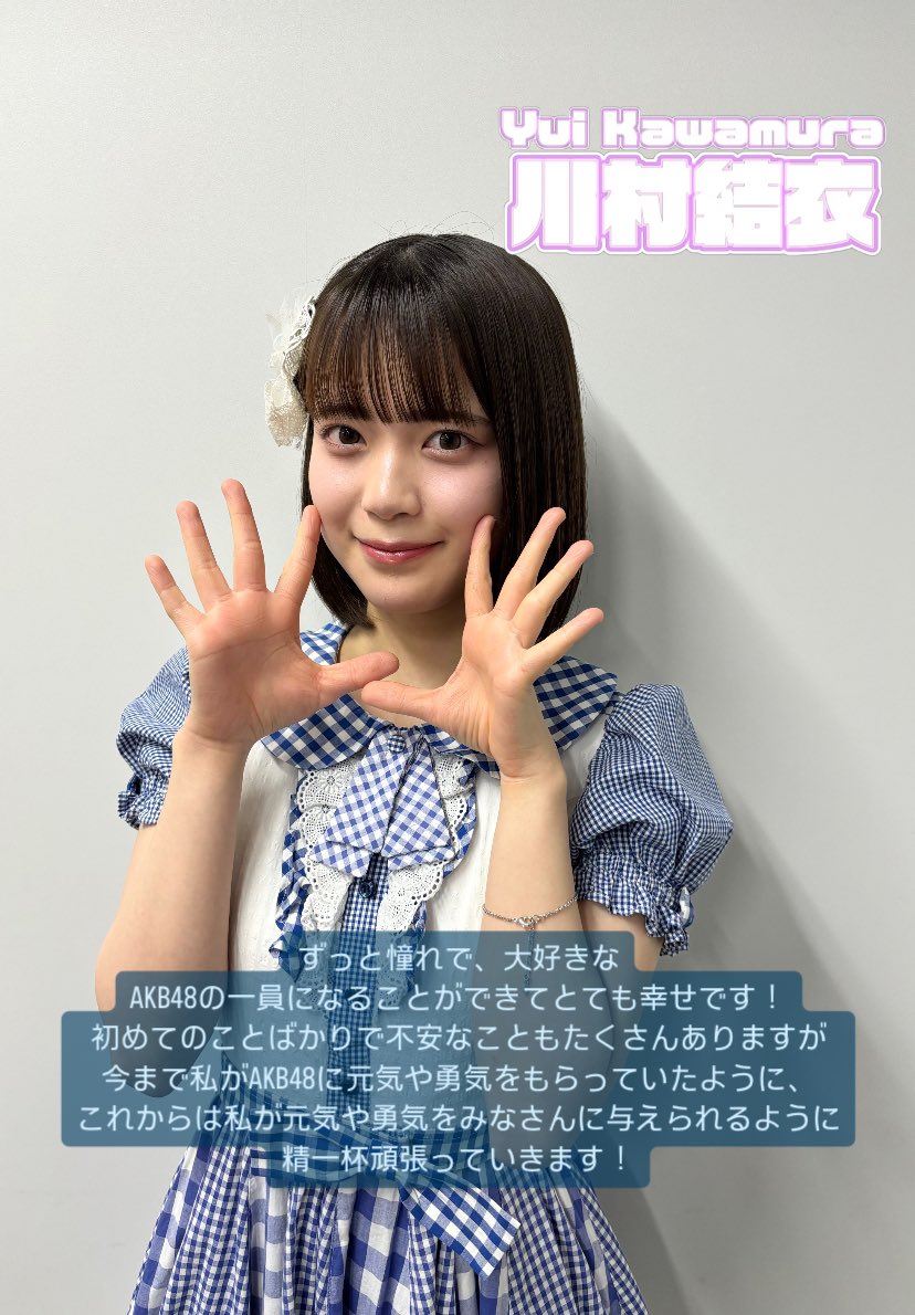 ずっと憧れで、大好きなAKB48の一員になることができてとても幸せです! 初めてのことばかりで不安なこともたくさんありますが、今まで私がAKB48に元気や勇気をもらっていたように、これからは私が元気や勇気を与えられる存在になれるように、精一杯頑張っていきます!