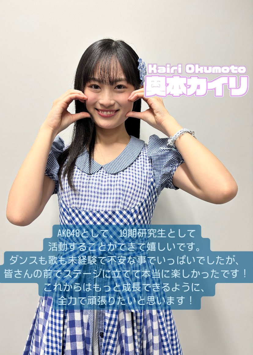 AKB48として、そして19期研究生として活動することができて嬉しいです。ダンスも歌も未経験なので不安でいっぱいでしたが、みなさんの前でステージに立てて本当に楽しかったです。これからはもっと成⻑できるように、全力で頑張りたいと思います!