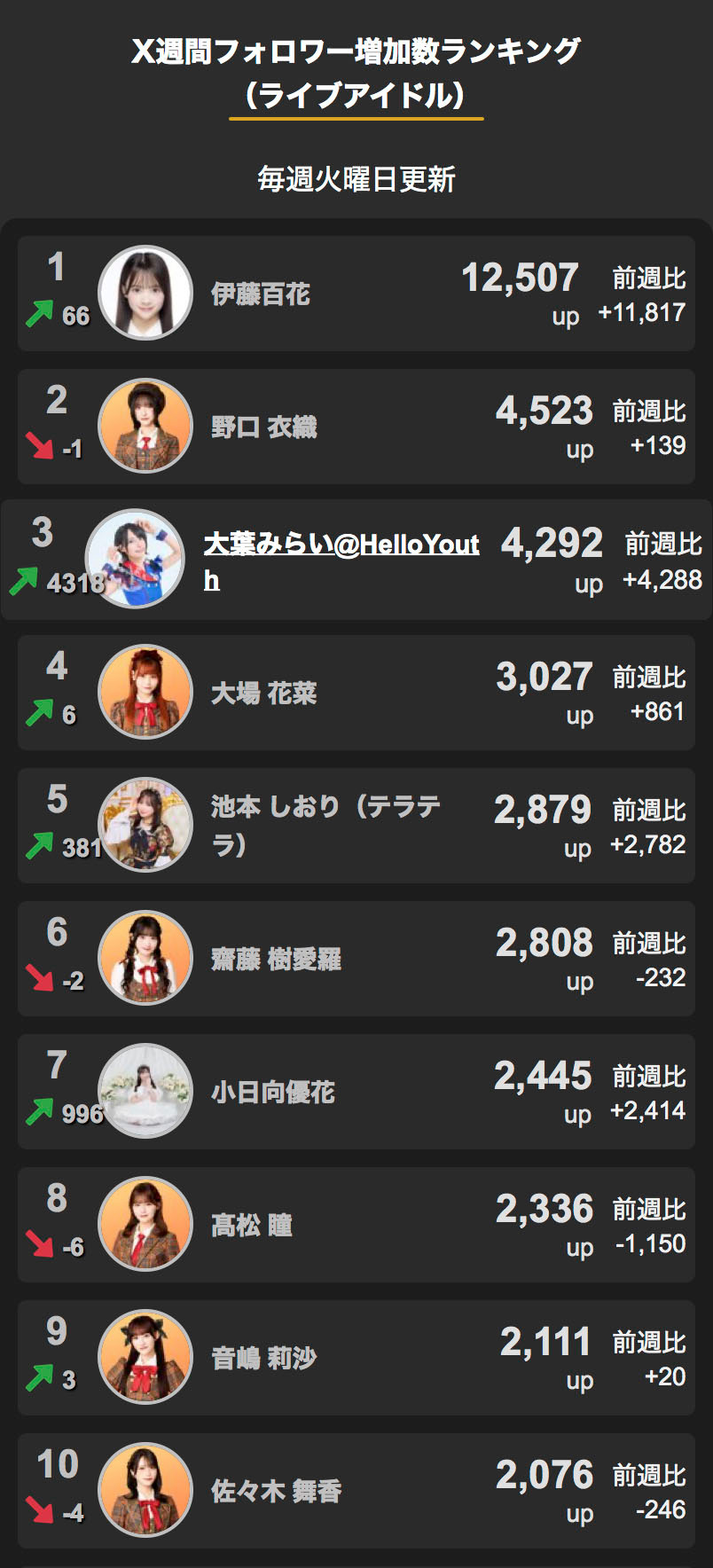 X-RankerというアイドルなどのXのフォロワー数のランキングを掲載しているサイトの「X週間フォロワー増加ランキング」でいとももが12,507フォロワー追加でダントツの1位になっています!(※全アイドルが掲載されている訳では無い)