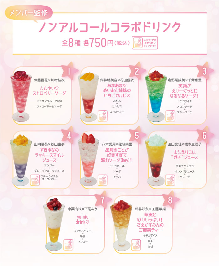 いともものコラボドリンクは伊藤百花×川村結衣ペアの「ももゆい♡ストロベリーソーダ(ドラゴンフルーツ+ストロベリー&ソーダ)」。かわゆいのいちご好きが採用されているようです。