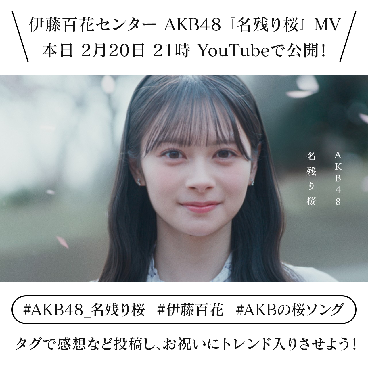2月25日(水)発売の伊藤百花センターAKB48 67th Single『名残り桜』ミュージックビデオが、2月20日(金)21時にYouTubeにてついにプレミア公開されます。