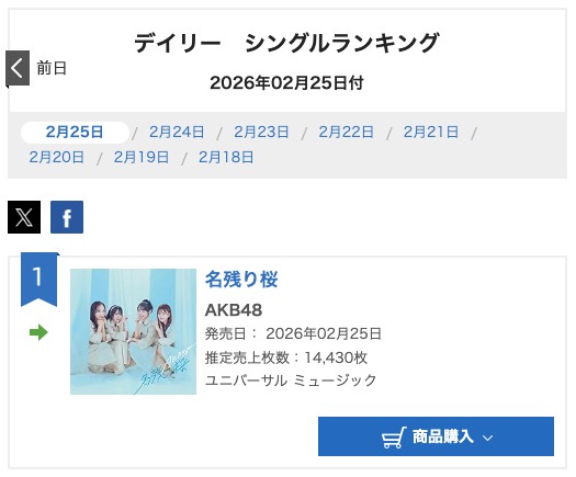 ユニバーサル移籍後最高初日売上を更新し、武道館ライブや年末の音楽番組、いとももへの注目度などでAKB48の人気が復活してきていることを物語っています。