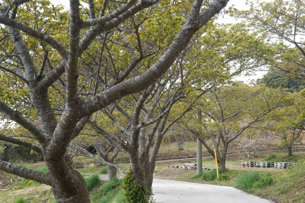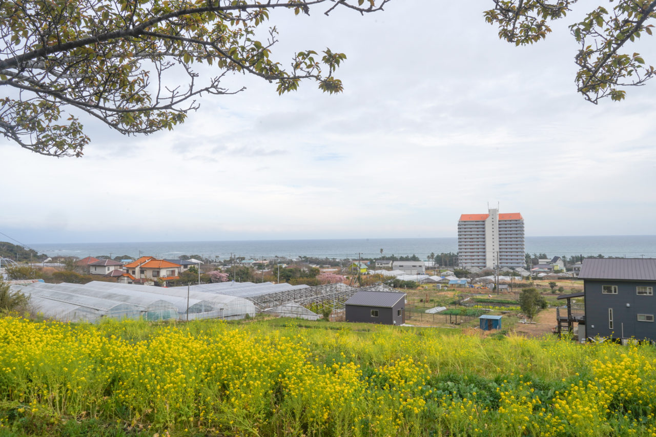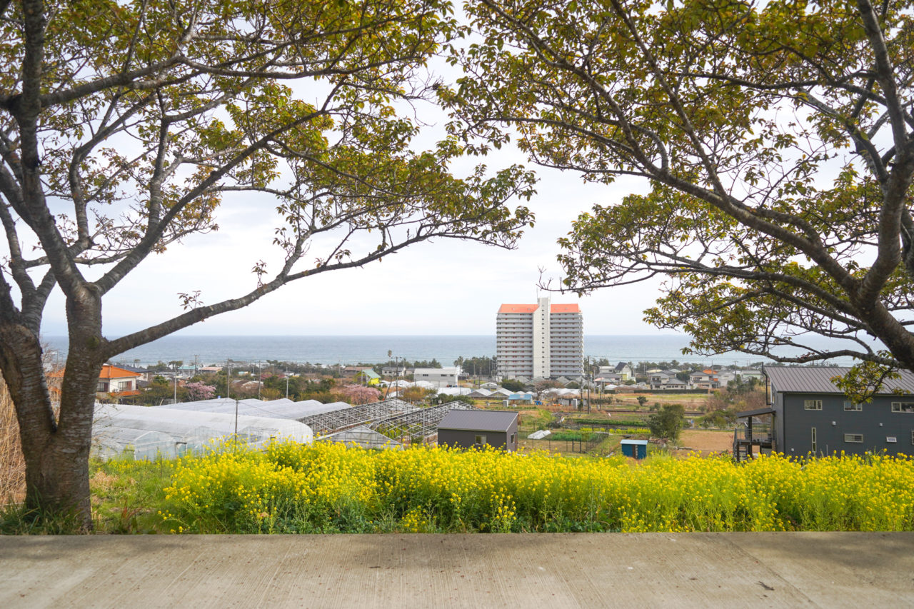 坂を登っていくと、見たことのある風景が!桜は撮影時とは別の種類が少し咲いていただけでしたが、菜の花も咲いていて海も見えるいい場所でした。
