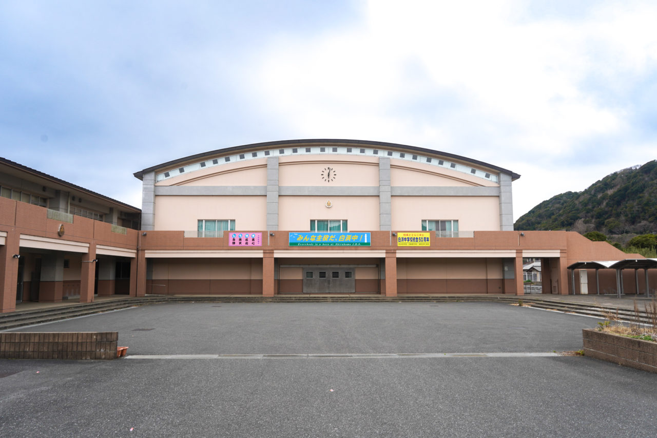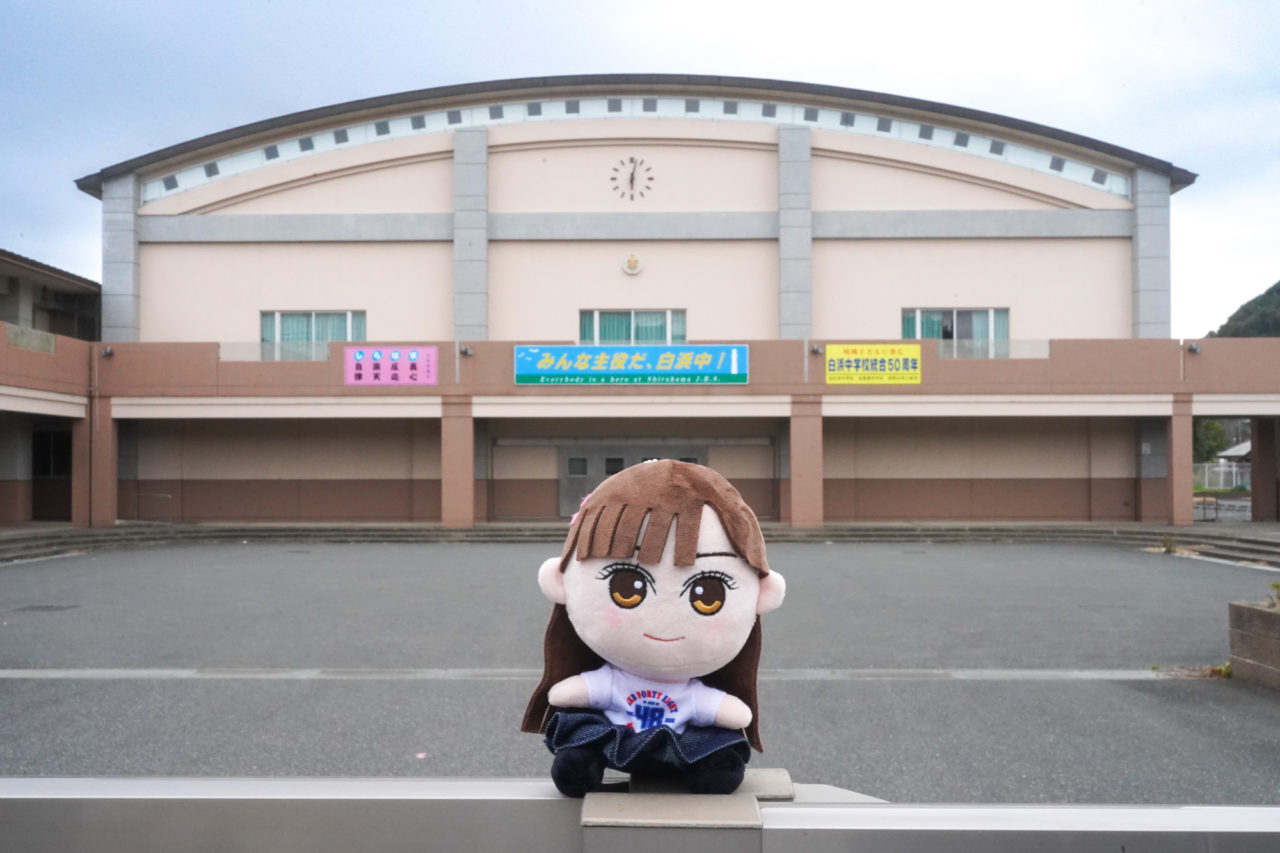 学校は閉校しており、現在は体育館のみ利用可能。きれいな学校なのに寂しいですね。学校のすぐ前の道が通学のシーンの場所です。