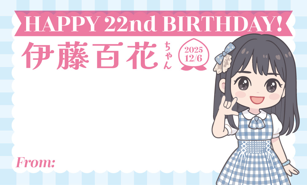 ももちゃんへ。ももちゃん22歳のお誕生日おめでとう。ももちゃんと出会ってからもうすぐ2年。こうして生誕祭でお手紙を書かせていただける仲になれたことがとってもうれしいです。まず、ももちゃんの第一印象はお顔が可愛いでした。このお顔で私よりも年上だったことも相まって、加入してしばらくの間は私から話しかけに行くことが少なかったと思います。