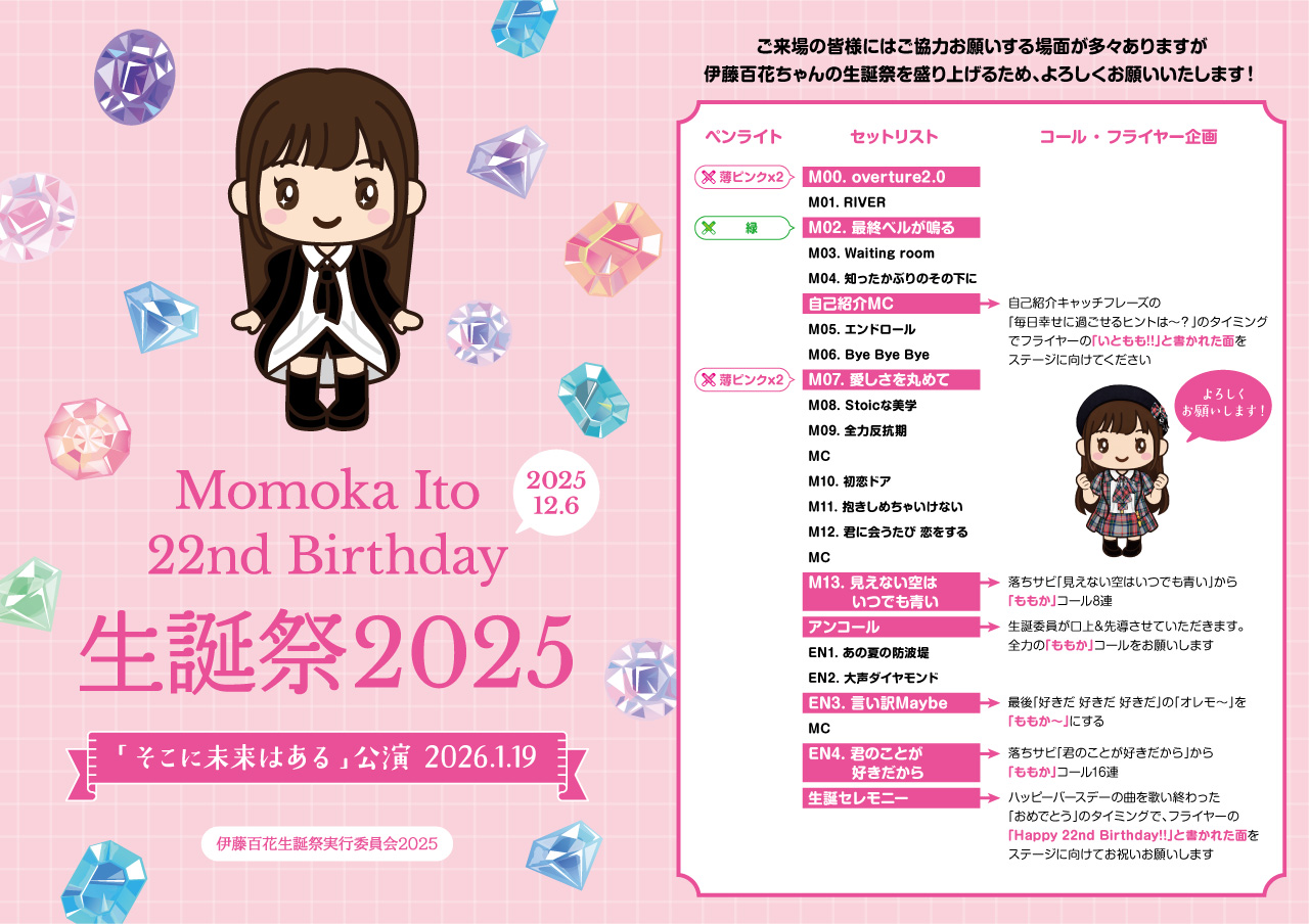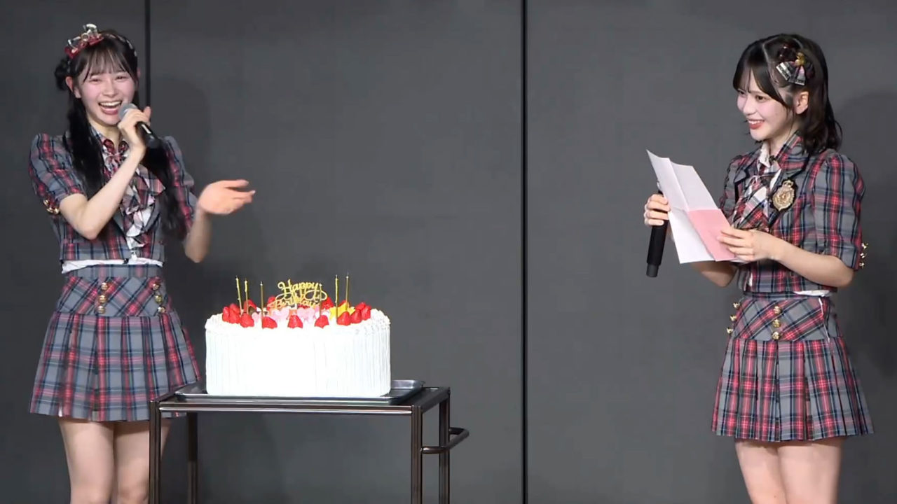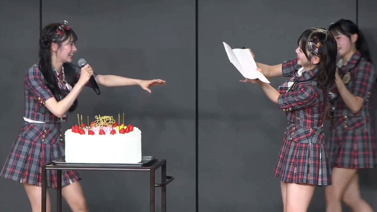 1月19日の「そこに未来はある」公演にて、伊藤百花の2度目となる生誕祭が開催され、会場は盛大な「ももか」コールに包まれました。今回は正規メンバーとしの生誕祭ということもあり、ケーキが登場し、心のこもったお手紙も披露されました。