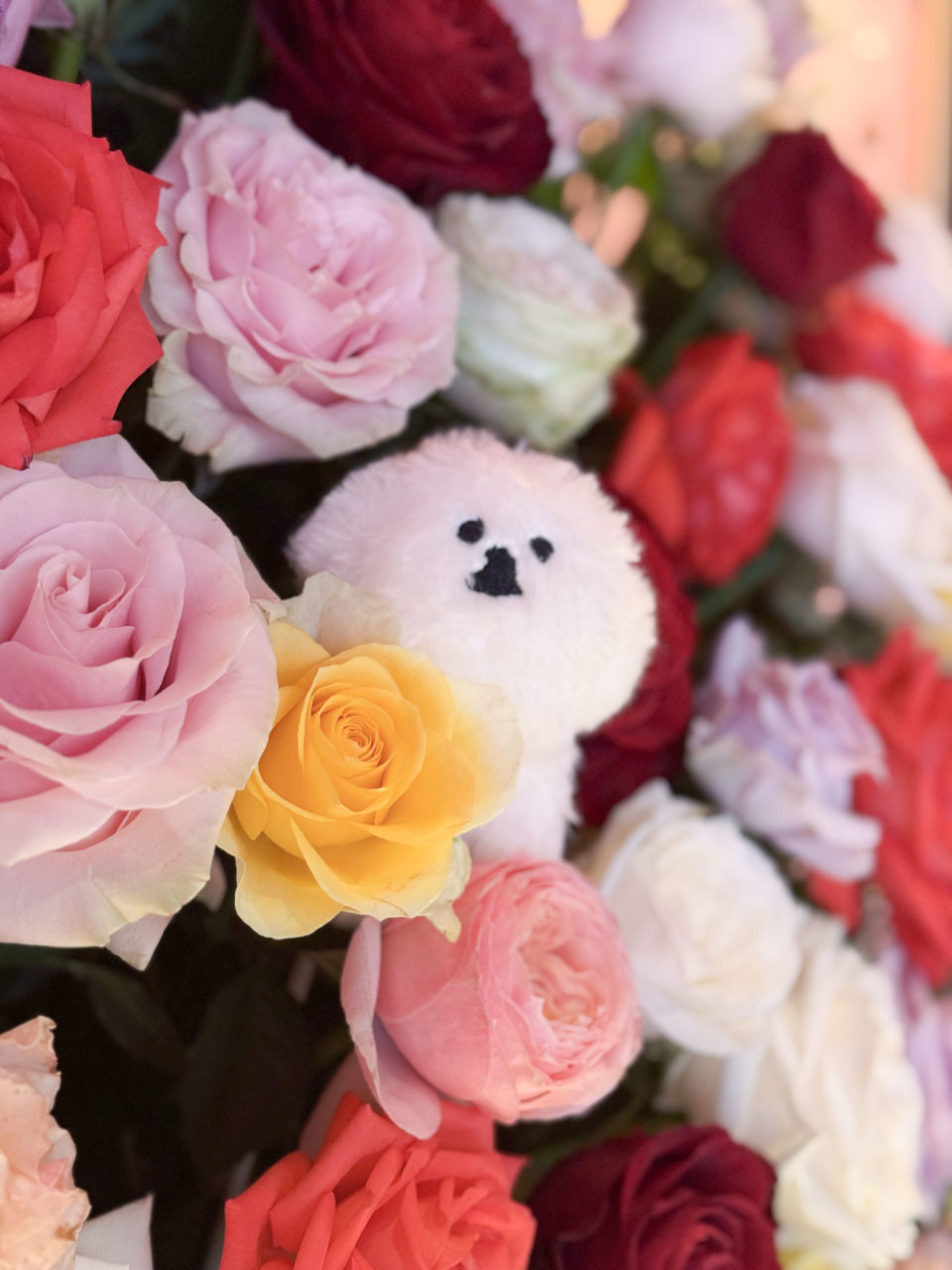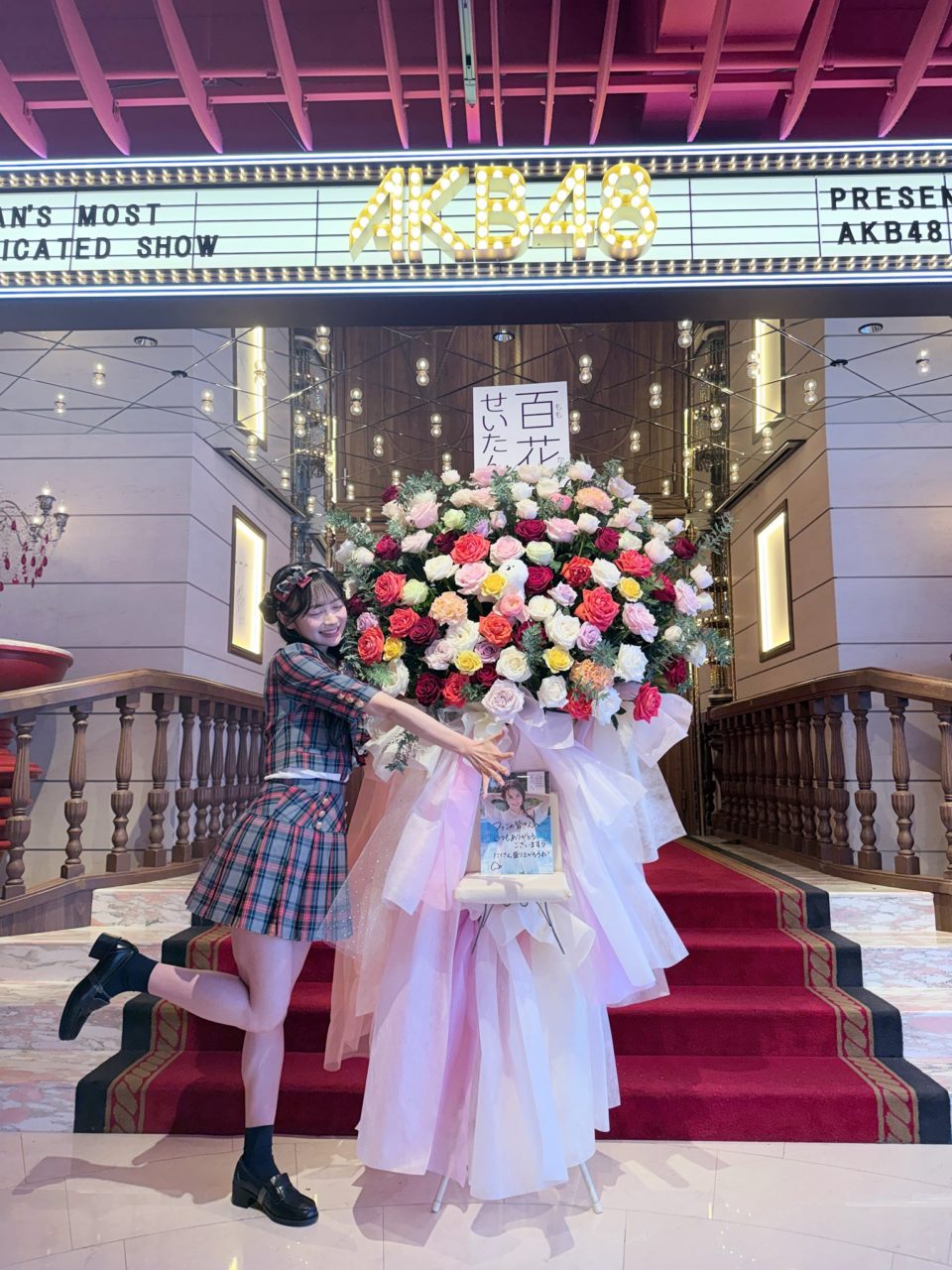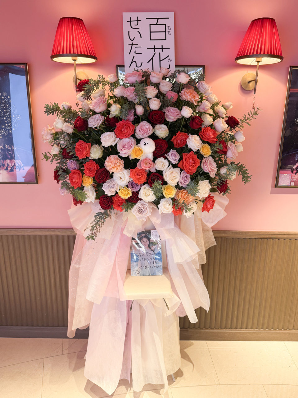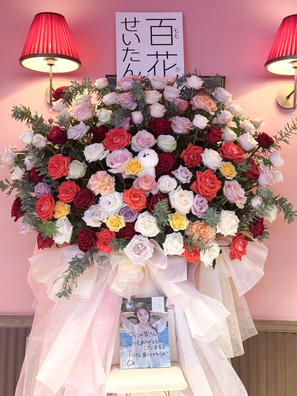 伊藤百花ファーストフォトブック「百花ずかん。」をモチーフに、百本の様々な色のバラをメインに、ビションフリーゼのぬいぐるみ、写真集(いとももがコメントを入れてくれました)、タイトルをもじった「百花せいたん。」のパネルを使用しています。